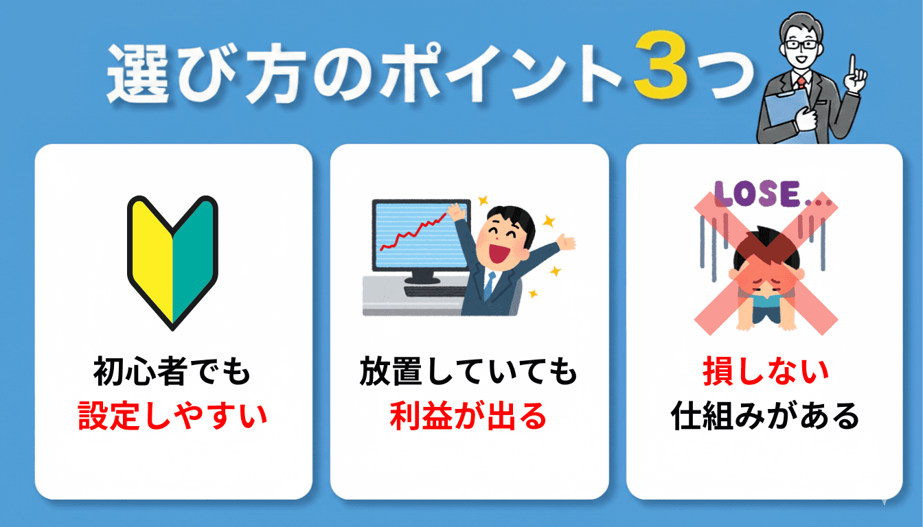 リスク管理さえしっかり行えば、自動で売買して利益が積み重なっていくため、設定に時間をかけたくない方、長期的に利用していきたいに方に向いているのではないでしょうか。ただし、一時的な含み損をある程度許容できないと、続けるのは難しいかもしれませんが…。