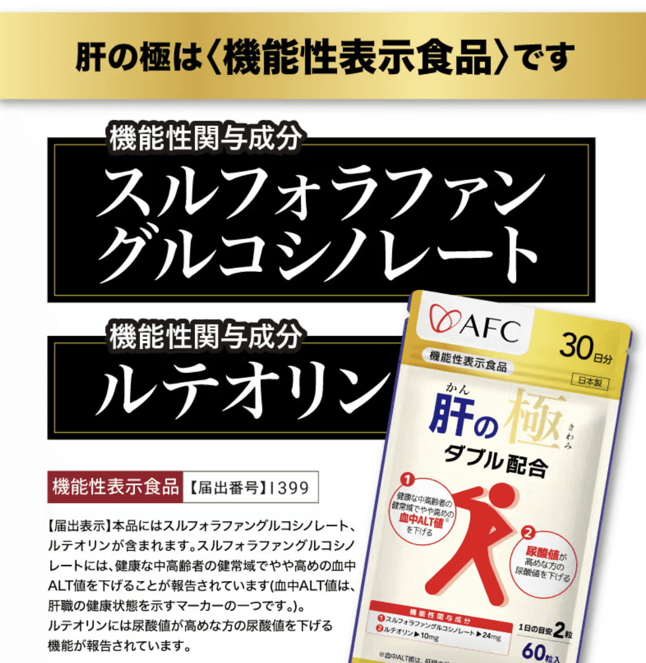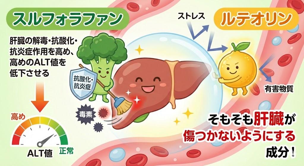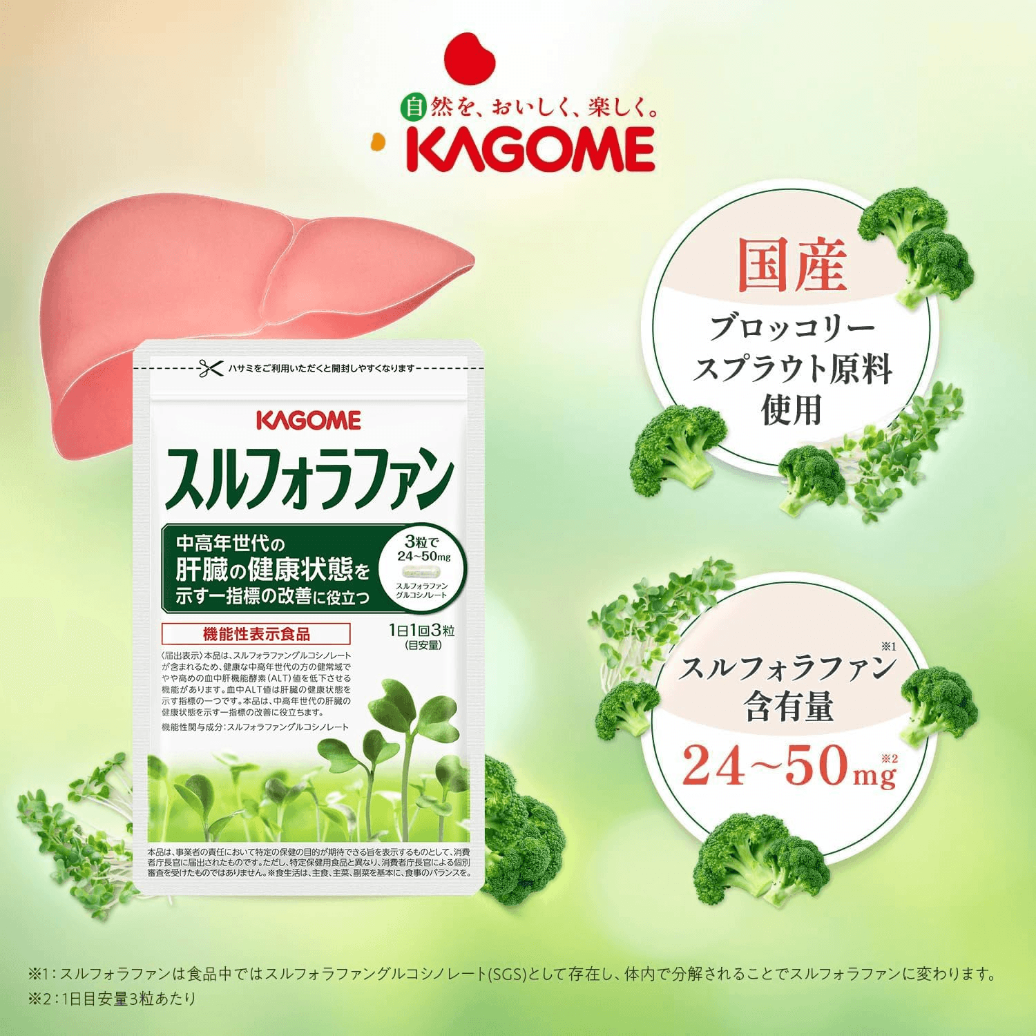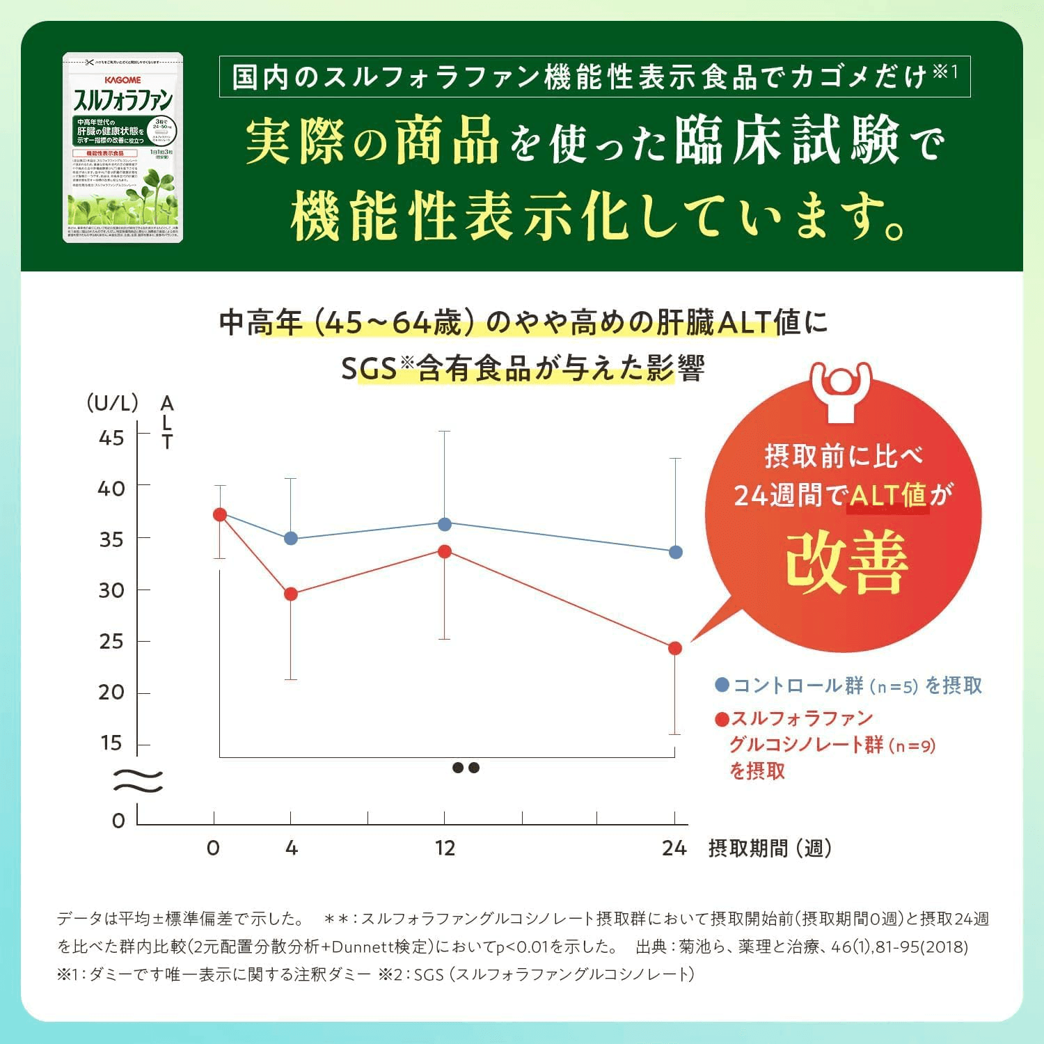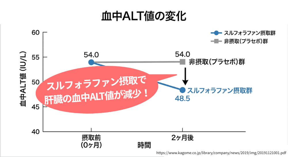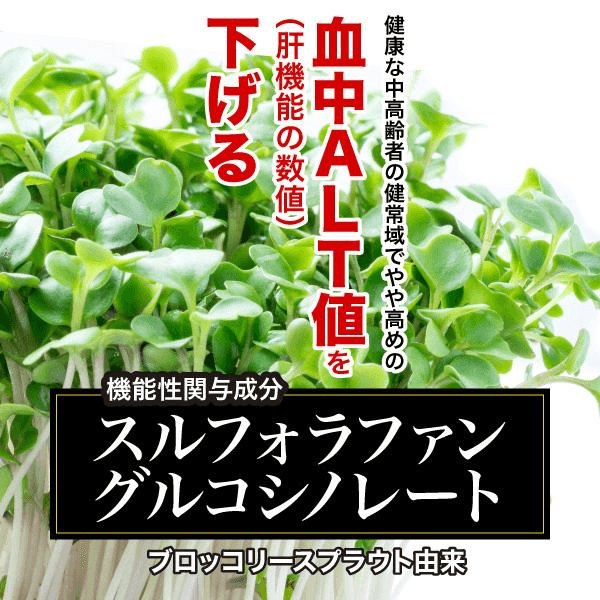 ※機能性成分“スルフォラファングルコシノレート”は、中高年世代において、肝臓のダメージを軽減し、血中 ALT 値(肝臓の健康状態を示す指標の一つ)を改善することを確認
