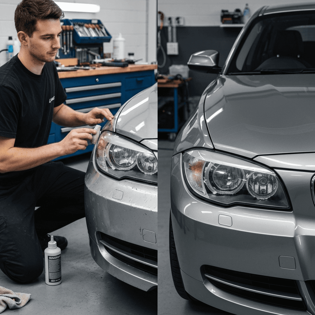1シリーズはヘッドライトの黄ばみとボディの鉄粉が第一印象を損ねます。研磨+鉄粉除去クリーナー+ワックスで輝きを取り戻せば「程度良好」と判断され+4~7万円の効果。