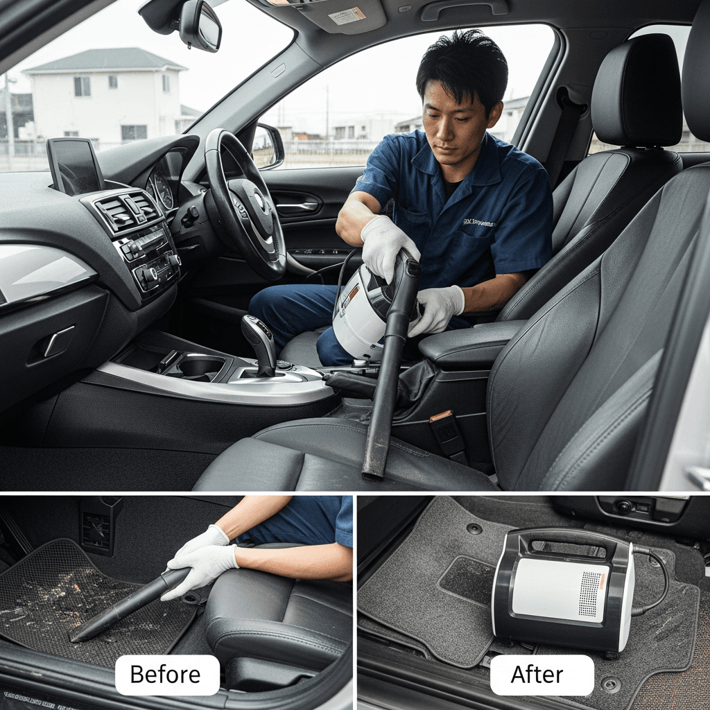 1シリーズは第一印象が査定の8割を決めます。シート隙間のゴミ除去、マット洗浄、樹脂パーツ艶出しで新車級の清潔感に。特に臭いゼロなら「禁煙車」扱いで+5~8万円UP。