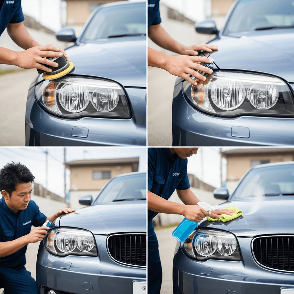 1シリーズクーペはヘッドライトの黄ばみとボディの鉄粉が第一印象を損ねます。研磨+鉄粉除去クリーナー+ワックスで輝きを取り戻せば「程度良好」と判断され+4~7万円の効果。