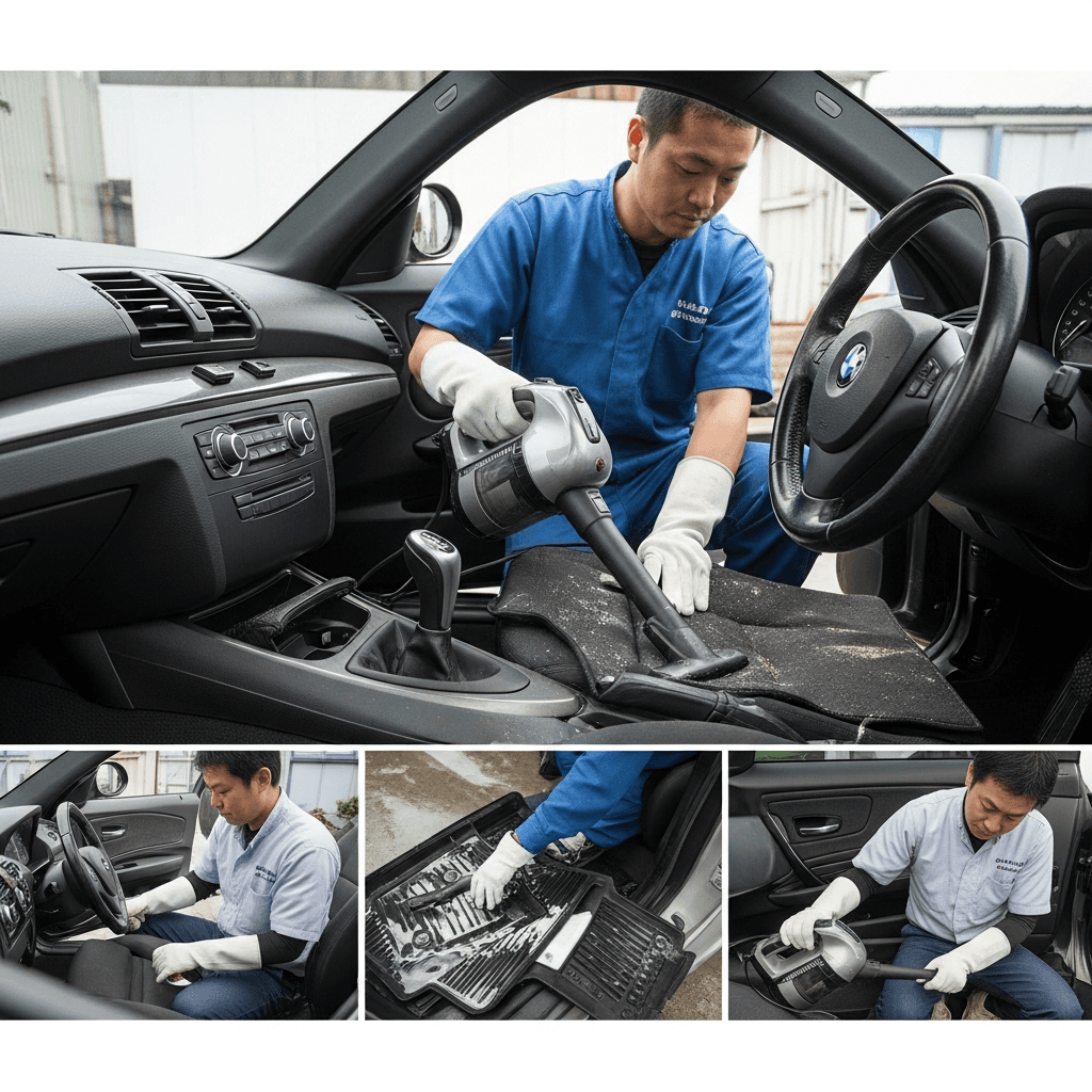 1シリーズクーペは第一印象が査定の8割を決めます。シート隙間のゴミ除去、マット洗浄、樹脂パーツ艶出しで新車級の清潔感に。特に臭いゼロなら「禁煙車」扱いで+5~8万円UP。