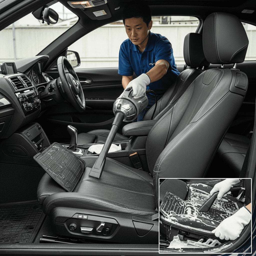 2シリーズクーペは第一印象が査定の8割を決めます。シート隙間のゴミ除去、マット洗浄、樹脂パーツ艶出しで新車級の清潔感に。特に臭いゼロなら「禁煙車」扱いで+5~8万円UP。