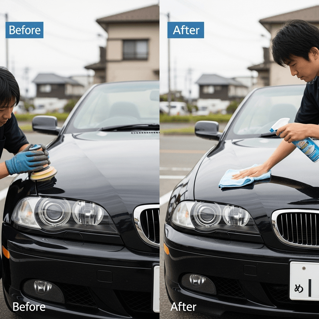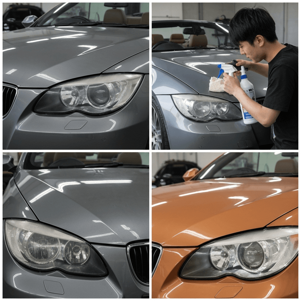 3シリーズカブリオレはヘッドライトの黄ばみとボディの鉄粉が第一印象を損ねます。研磨+鉄粉除去クリーナー+ワックスで輝きを取り戻せば「程度良好」と判断され+4~7万円の効果。
