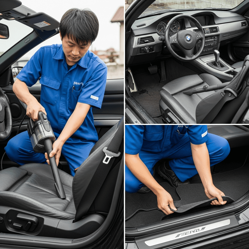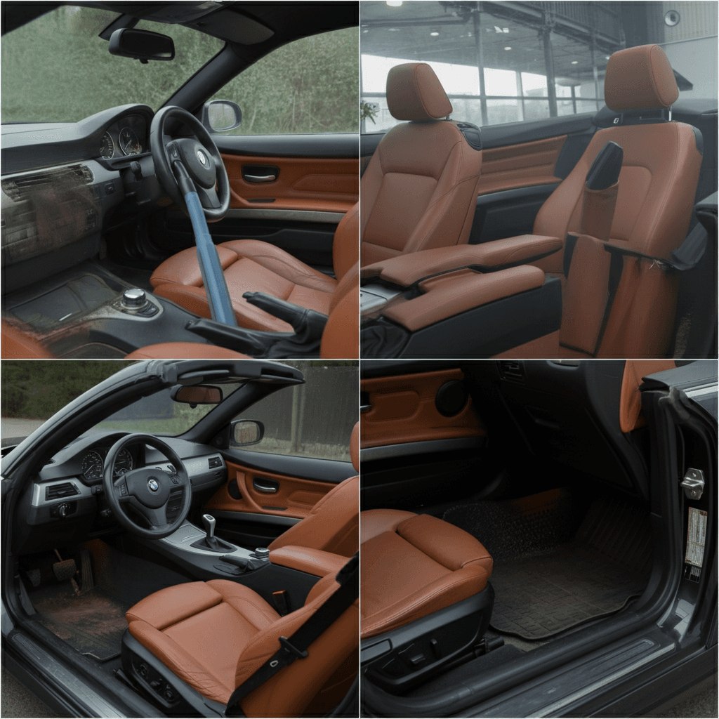 3シリーズカブリオレは第一印象が査定の8割を決めます。シート隙間のゴミ除去、マット洗浄、樹脂パーツ艶出しで新車級の清潔感に。特に臭いゼロなら「禁煙車」扱いで+5~8万円UP。