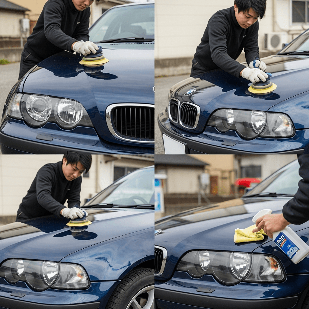 3シリーズコンパクトはヘッドライトの黄ばみとボディの鉄粉が第一印象を損ねます。研磨+鉄粉除去クリーナー+ワックスで輝きを取り戻せば「程度良好」と判断され+4~7万円の効果。