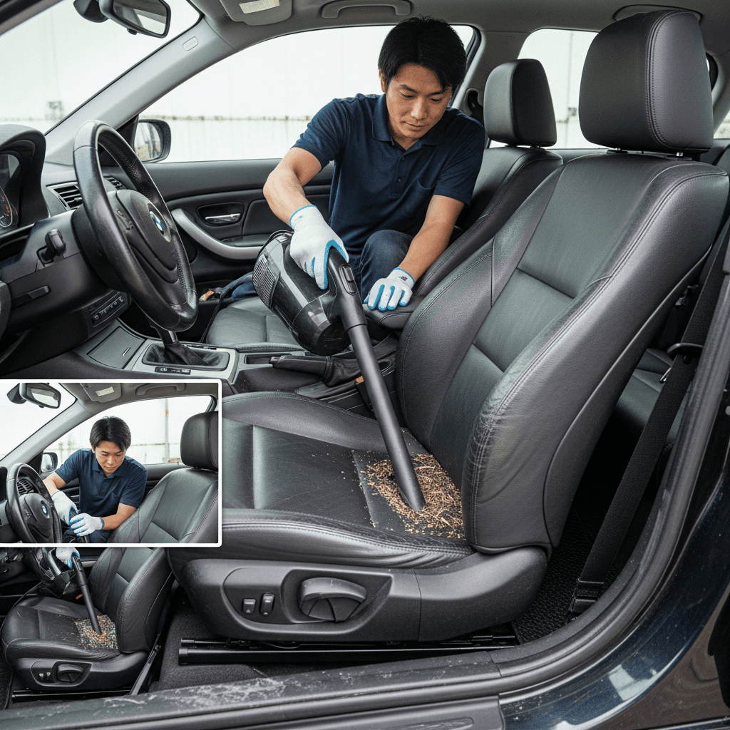 3シリーズコンパクトは第一印象が査定の8割を決めます。シート隙間のゴミ除去、マット洗浄、樹脂パーツ艶出しで新車級の清潔感に。特に臭いゼロなら「禁煙車」扱いで+5~8万円UP。