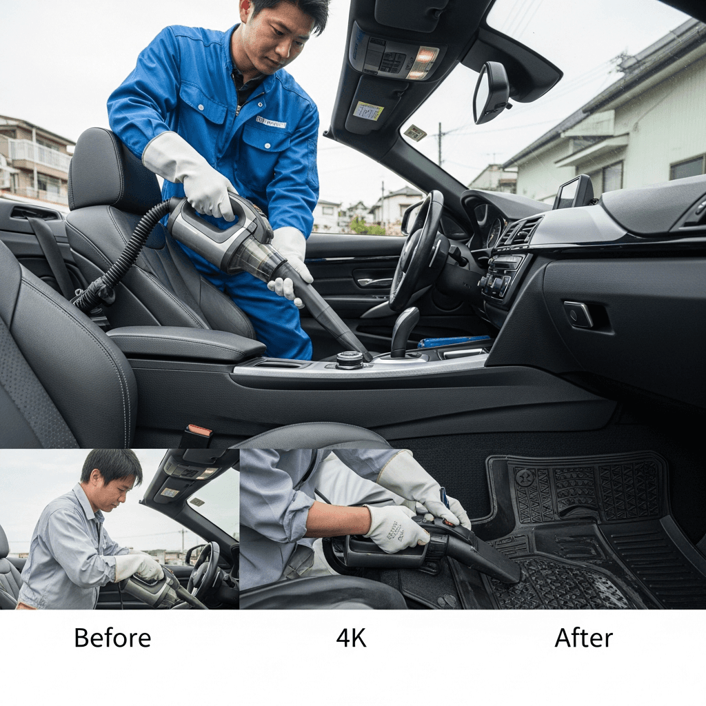 4シリーズカブリオレは第一印象が査定の8割を決めます。シート隙間のゴミ除去、マット洗浄、樹脂パーツ艶出しで新車級の清潔感に。特に臭いゼロなら「禁煙車」扱いで+5~8万円UP。