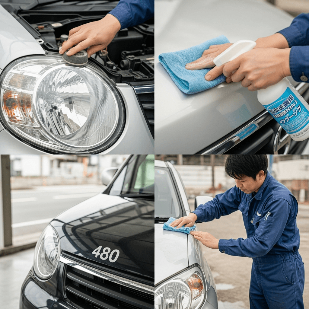 480はヘッドライトの黄ばみとボディの鉄粉が第一印象を損ねます。研磨+鉄粉除去クリーナー+ワックスで輝きを取り戻せば「程度良好」と判断され+4~7万円の効果。