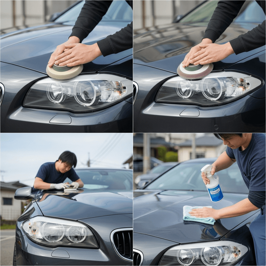 5シリーズはヘッドライトの黄ばみとボディの鉄粉が第一印象を損ねます。研磨+鉄粉除去クリーナー+ワックスで輝きを取り戻せば「程度良好」と判断され+4~7万円の効果。
