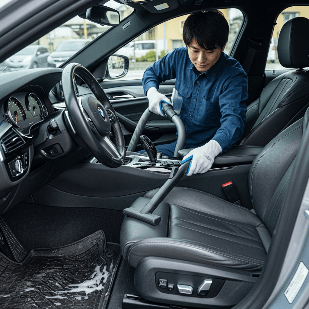 5シリーズは第一印象が査定の8割を決めます。シート隙間のゴミ除去、マット洗浄、樹脂パーツ艶出しで新車級の清潔感に。特に臭いゼロなら「禁煙車」扱いで+5~8万円UP。