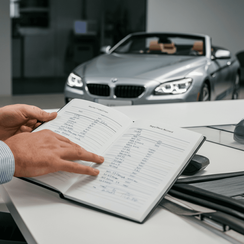 6シリーズカブリオレの整備記録簿に定期点検(12ヶ月・24ヶ月)の履歴が全て記載されていれば「管理の行き届いた車」と高評価。特にエンジンオイル交換履歴は重要で+6~9万円の効果。