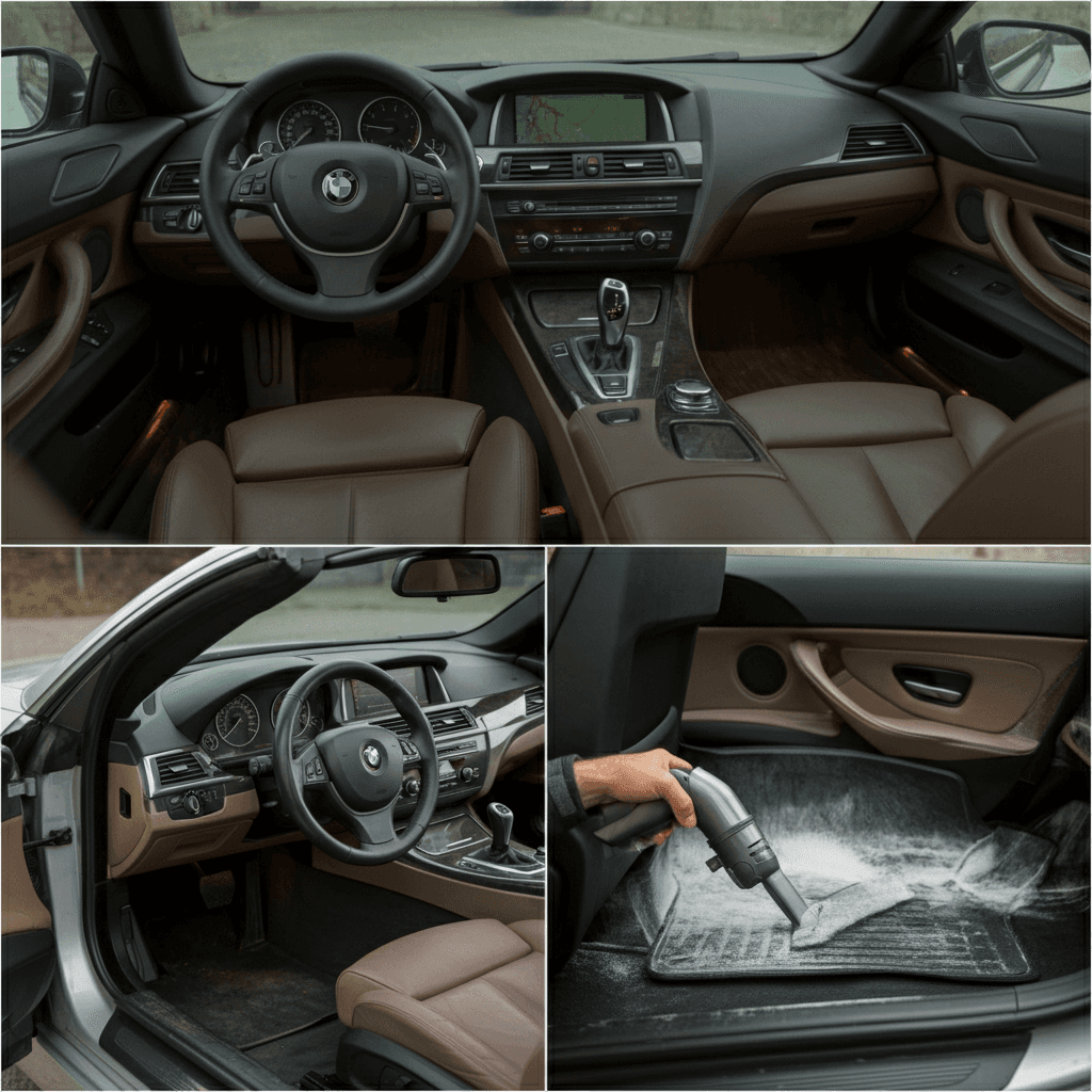 6シリーズカブリオレは第一印象が査定の8割を決めます。シート隙間のゴミ除去、マット洗浄、樹脂パーツ艶出しで新車級の清潔感に。特に臭いゼロなら「禁煙車」扱いで+5~8万円UP。