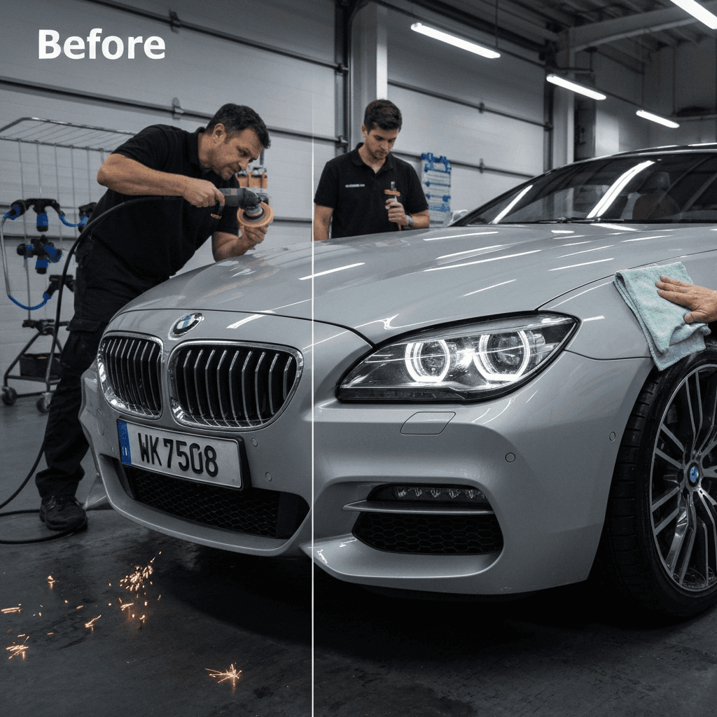 6シリーズグランクーペはヘッドライトの黄ばみとボディの鉄粉が第一印象を損ねます。研磨+鉄粉除去クリーナー+ワックスで輝きを取り戻せば「程度良好」と判断され+4~7万円の効果。