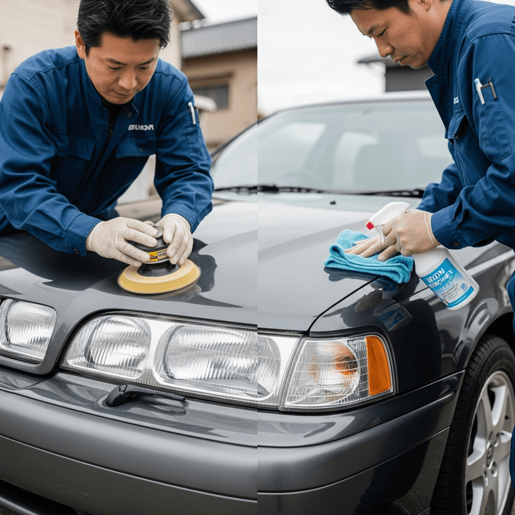 940はヘッドライトの黄ばみとボディの鉄粉が第一印象を損ねます。研磨+鉄粉除去クリーナー+ワックスで輝きを取り戻せば「程度良好」と判断され+4~7万円の効果。