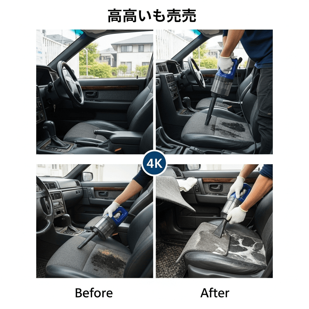 960は第一印象が査定の8割を決めます。シート隙間のゴミ除去、マット洗浄、樹脂パーツ艶出しで新車級の清潔感に。特に臭いゼロなら「禁煙車」扱いで+5~8万円UP。