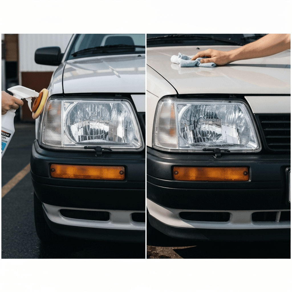 960エステートはヘッドライトの黄ばみとボディの鉄粉が第一印象を損ねます。研磨+鉄粉除去クリーナー+ワックスで輝きを取り戻せば「程度良好」と判断され+4~7万円の効果。