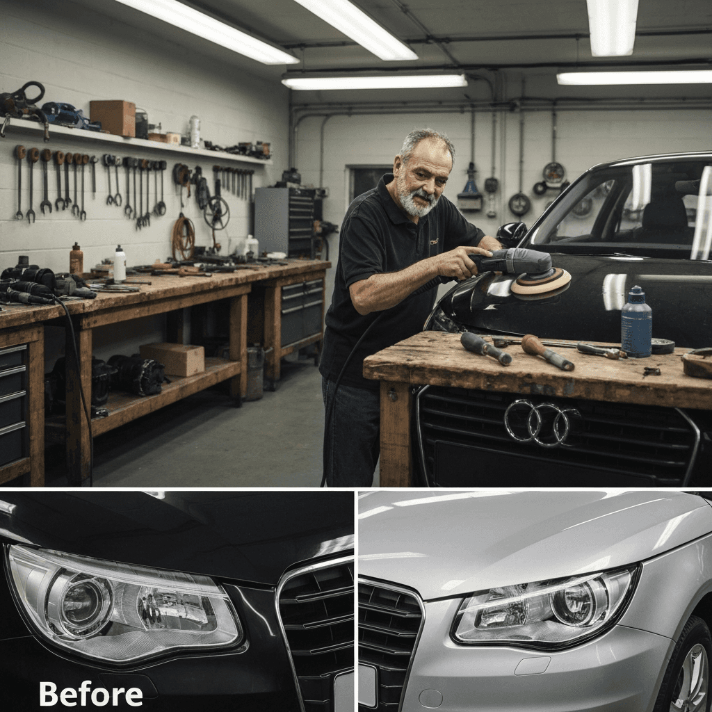 A1スポーツバックはヘッドライトの黄ばみとボディの鉄粉が第一印象を損ねます。研磨+鉄粉除去クリーナー+ワックスで輝きを取り戻せば「程度良好」と判断され+4~7万円の効果。