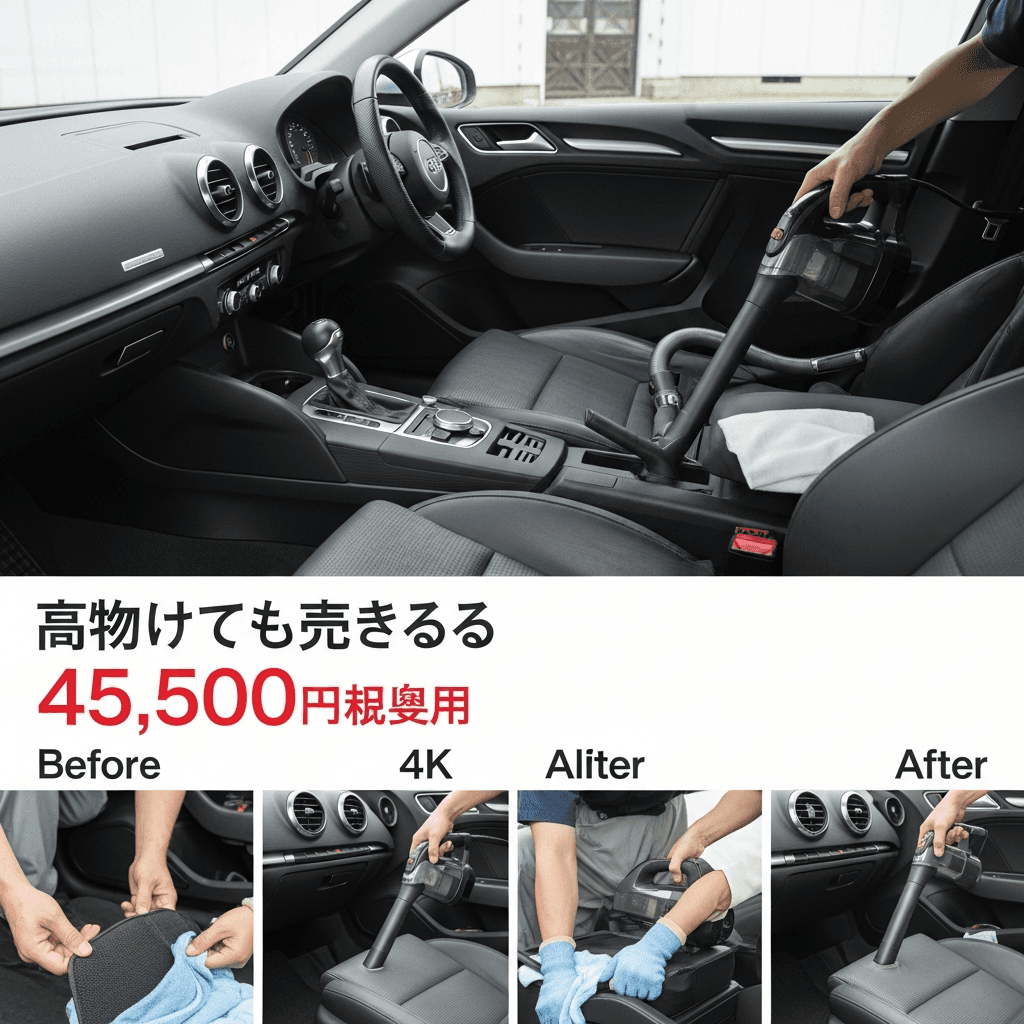 A3セダンは第一印象が査定の8割を決めます。シート隙間のゴミ除去、マット洗浄、樹脂パーツ艶出しで新車級の清潔感に。特に臭いゼロなら「禁煙車」扱いで+5~8万円UP。