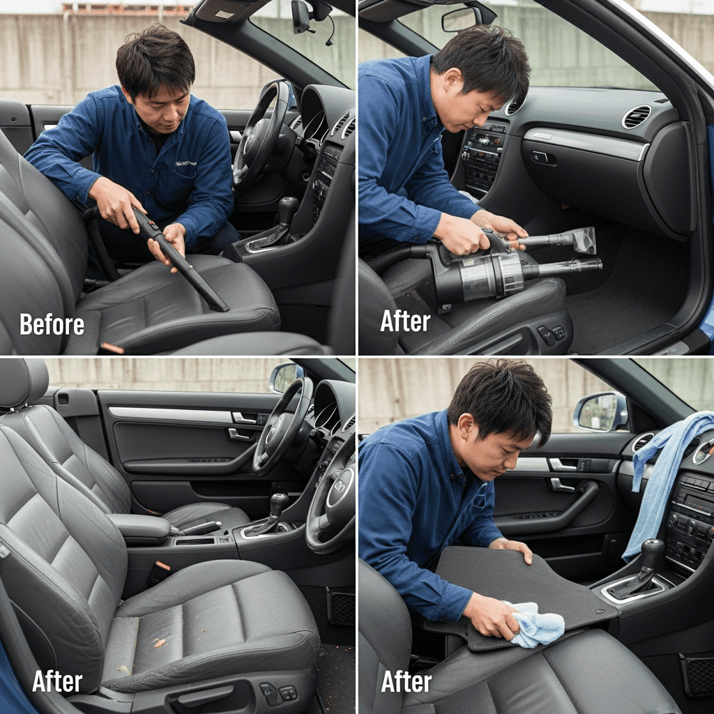 A4カブリオレは第一印象が査定の8割を決めます。シート隙間のゴミ除去、マット洗浄、樹脂パーツ艶出しで新車級の清潔感に。特に臭いゼロなら「禁煙車」扱いで+5~8万円UP。
