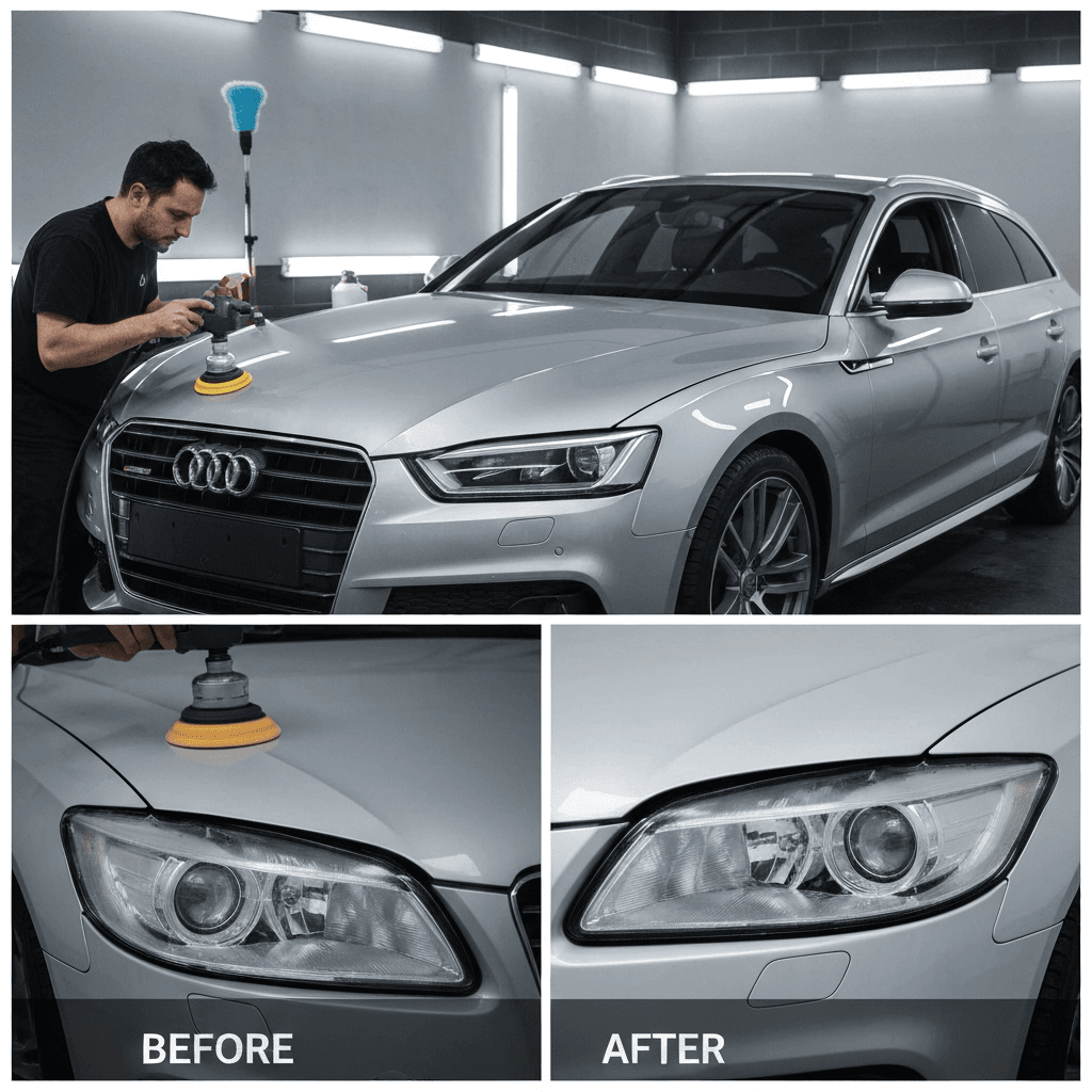 A5アバントはヘッドライトの黄ばみとボディの鉄粉が第一印象を損ねます。研磨+鉄粉除去クリーナー+ワックスで輝きを取り戻せば「程度良好」と判断され+4~7万円の効果。