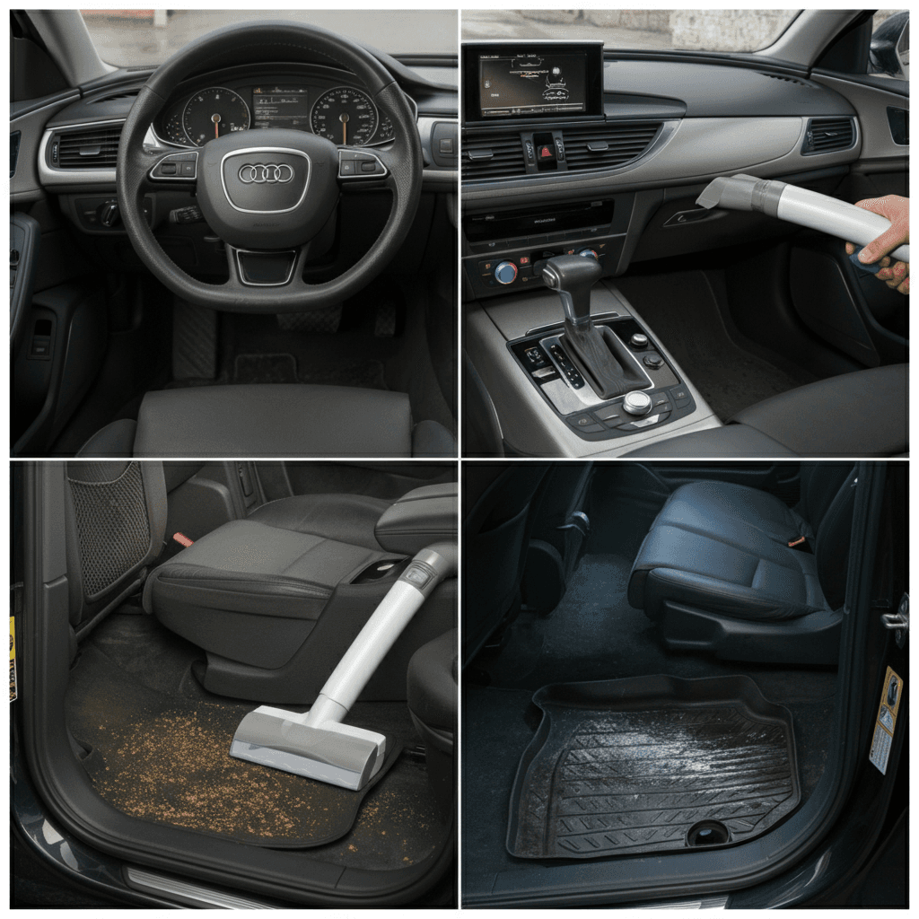 A6アバントe-tronは第一印象が査定の8割を決めます。シート隙間のゴミ除去、マット洗浄、樹脂パーツ艶出しで新車級の清潔感に。特に臭いゼロなら「禁煙車」扱いで+5~8万円UP。