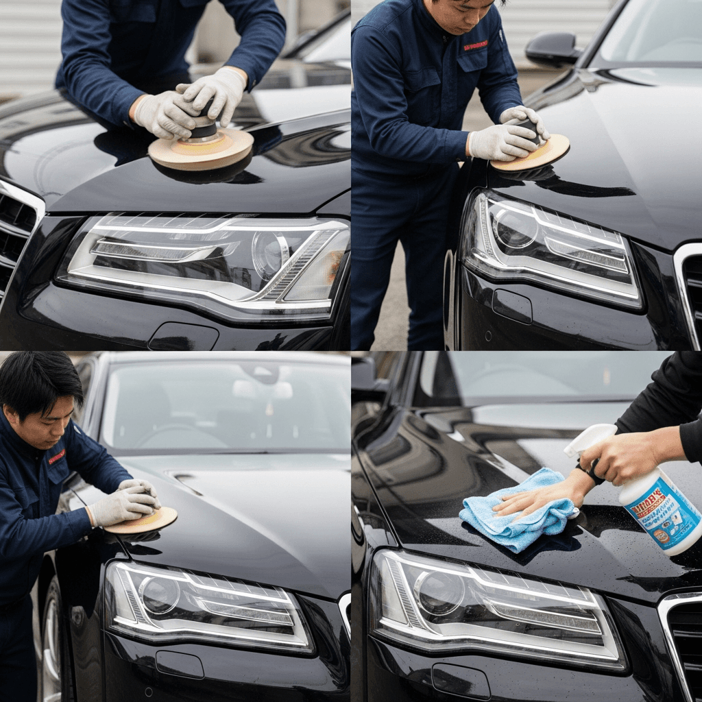 A8はヘッドライトの黄ばみとボディの鉄粉が第一印象を損ねます。研磨+鉄粉除去クリーナー+ワックスで輝きを取り戻せば「程度良好」と判断され+4~7万円の効果。