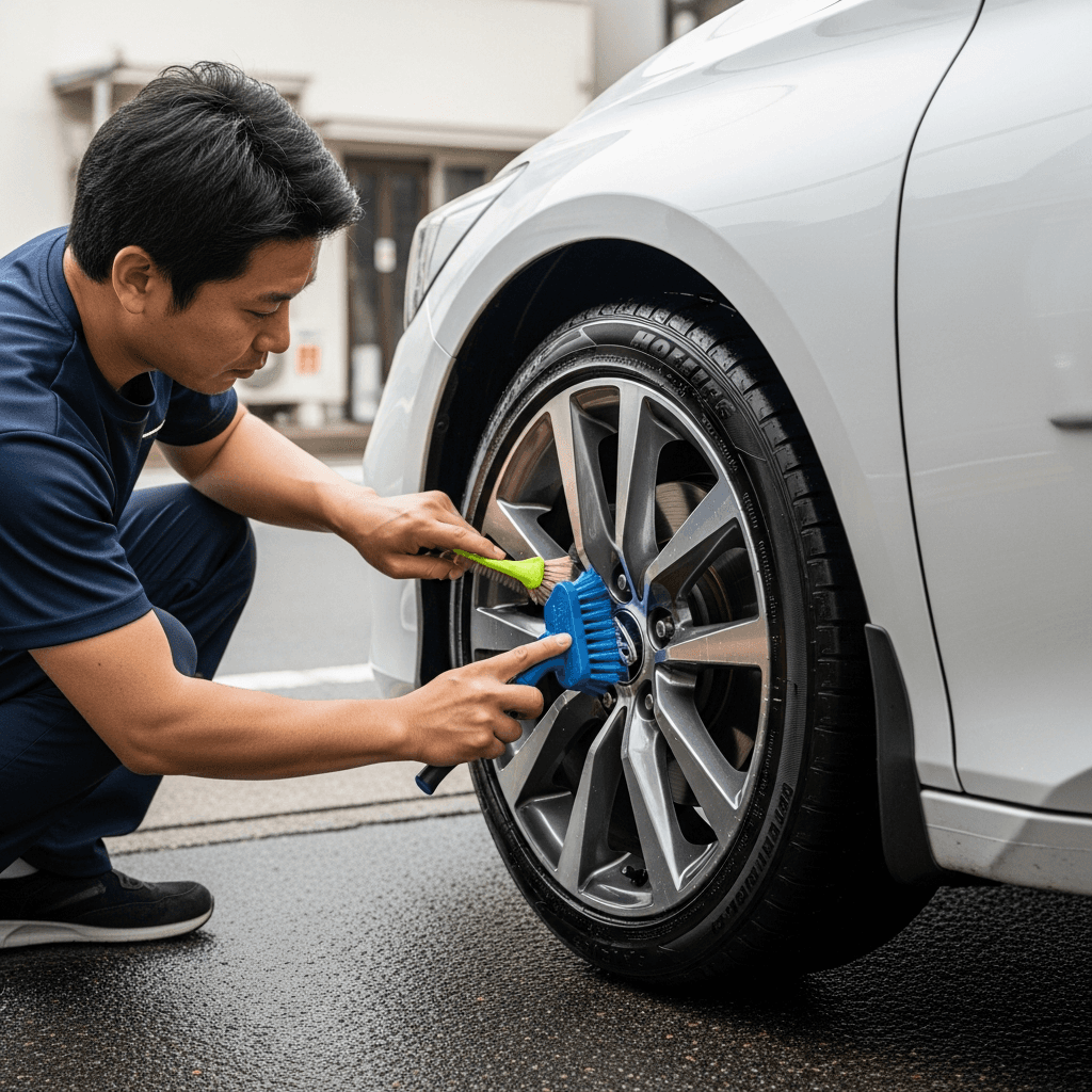 セダンは純正アルミホイールの傷が目立ちやすい。ホイールクリーナーで洗浄+タイヤ溝5mm以上確保で「足回り良好」評価。特にアコードインスパイアは高級感が重要で+6~9万円の効果。