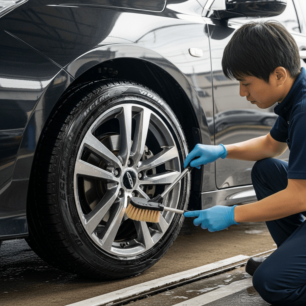 セダンは純正アルミホイールの傷が目立ちやすい。ホイールクリーナーで洗浄+タイヤ溝5mm以上確保で「足回り良好」評価。特にアコードワゴンは高級感が重要で+6~9万円の効果。