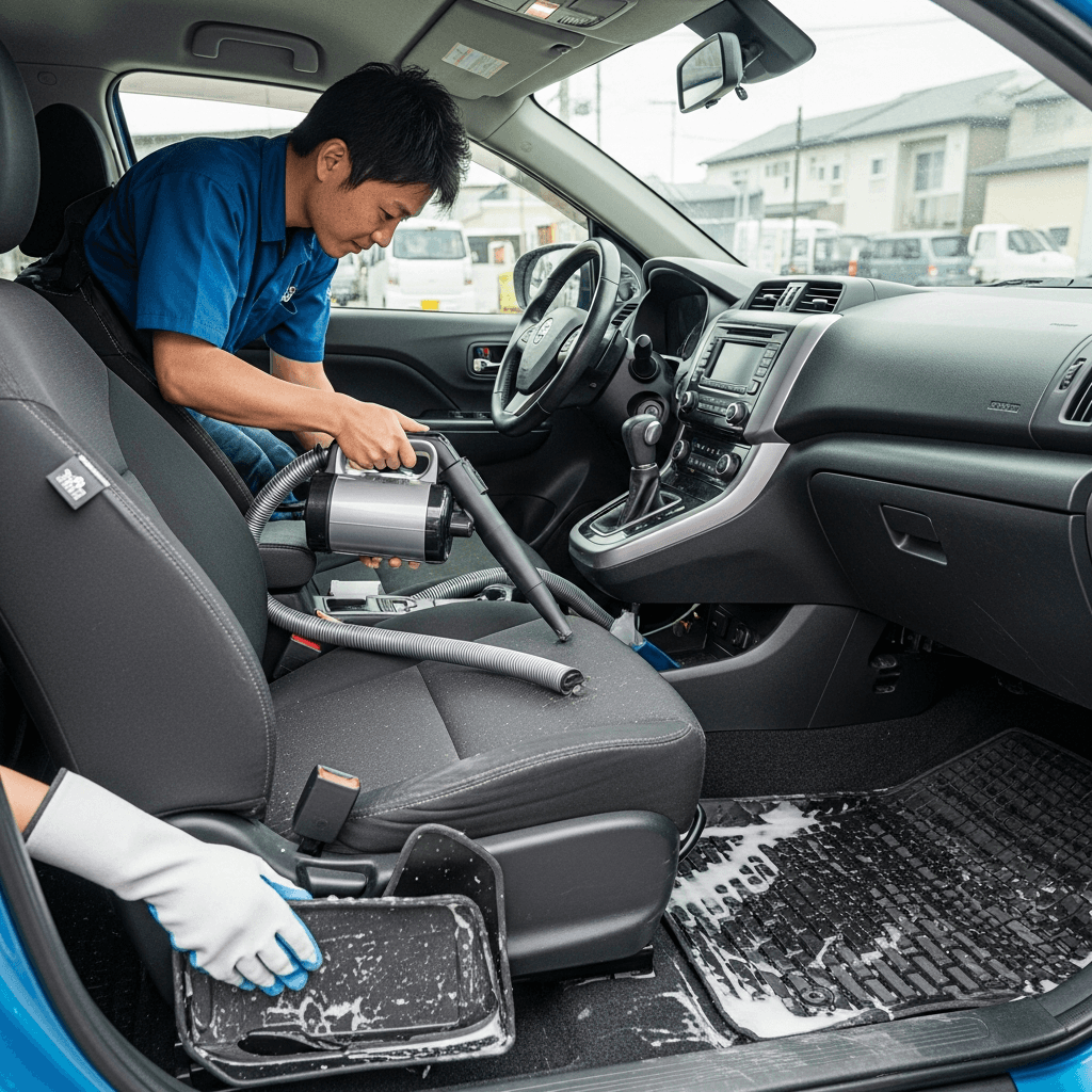 AD-MAXワゴンは第一印象が査定の8割を決めます。シート隙間のゴミ除去、マット洗浄、樹脂パーツ艶出しで新車級の清潔感に。特に臭いゼロなら「禁煙車」扱いで+5~8万円UP。