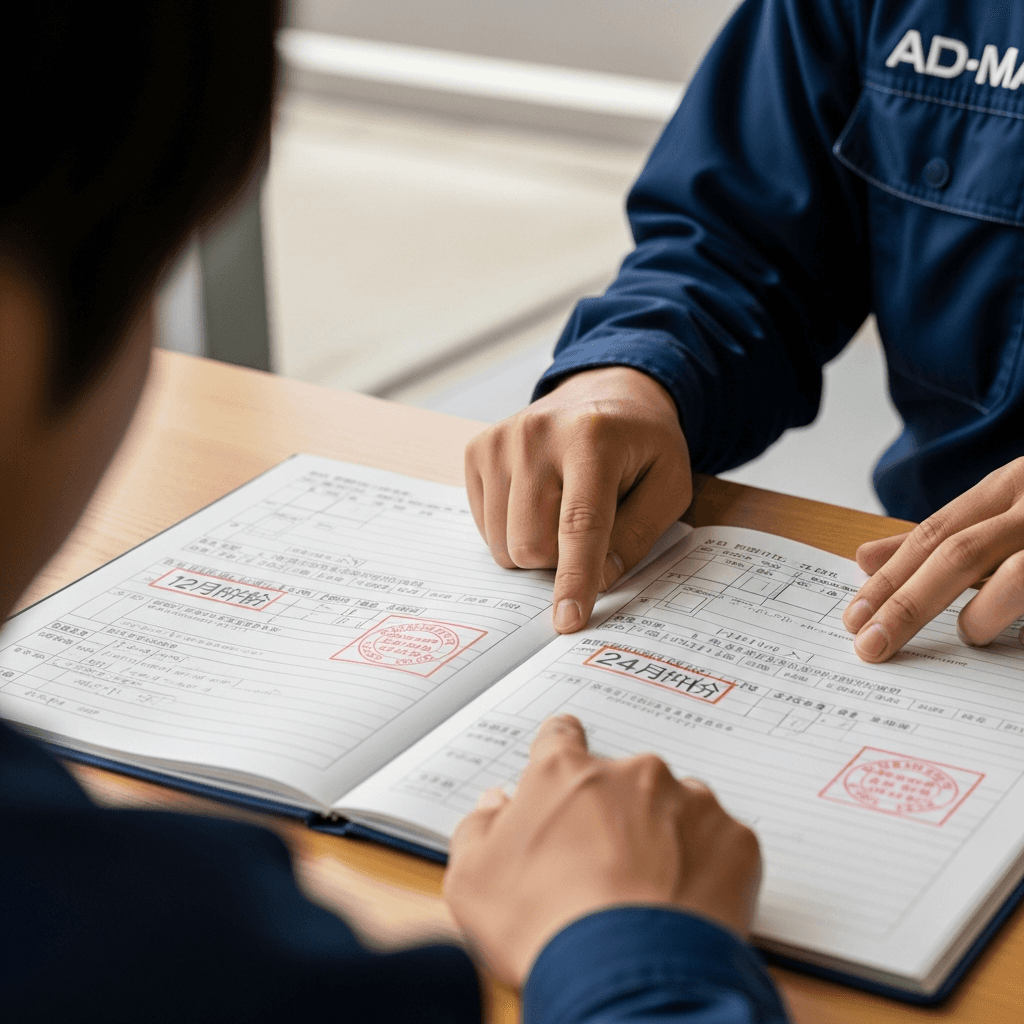 AD-MAXワゴンの整備記録簿に定期点検(12ヶ月・24ヶ月)の履歴が全て記載されていれば「管理の行き届いた車」と高評価。特にエンジンオイル交換履歴は重要で+6~9万円の効果。