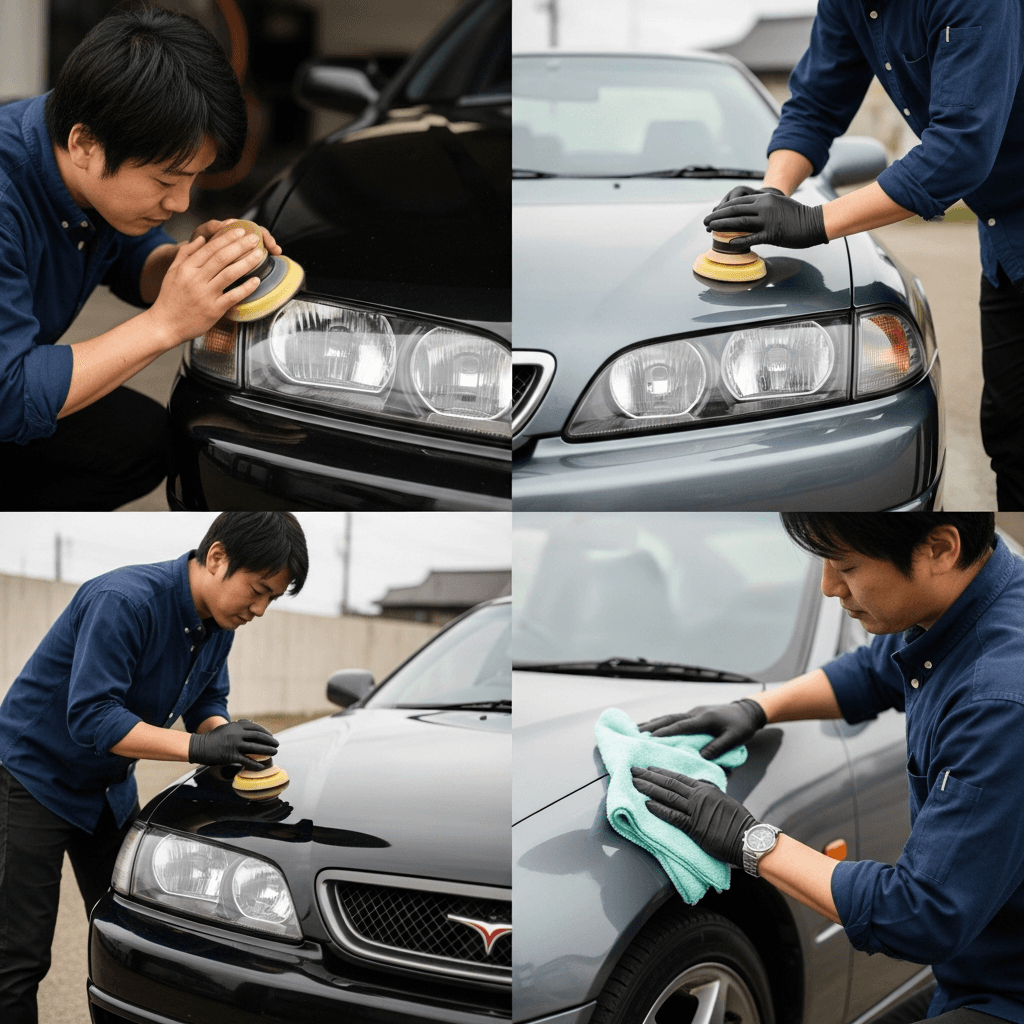 アルシオーネSVXはヘッドライトの黄ばみとボディの鉄粉が第一印象を損ねます。研磨+鉄粉除去クリーナー+ワックスで輝きを取り戻せば「程度良好」と判断され+4~7万円の効果。