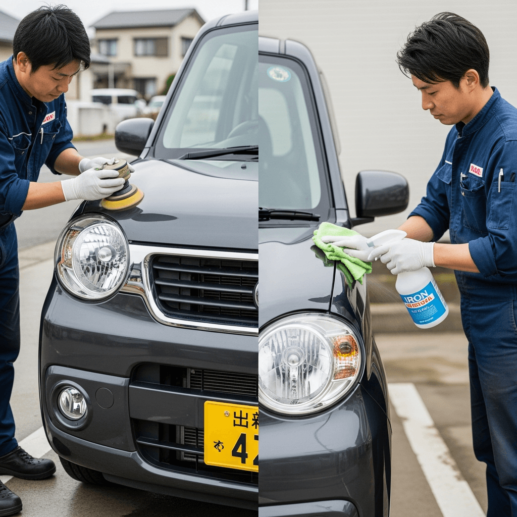 アレックスはヘッドライトの黄ばみとボディの鉄粉が第一印象を損ねます。研磨+鉄粉除去クリーナー+ワックスで輝きを取り戻せば「程度良好」と判断され+4~7万円の効果。