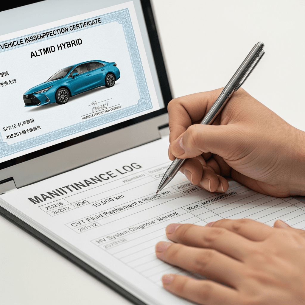 整備記録簿にCVTフルード交換やHVシステム診断の履歴を明記。特に「10万km時CVT交換済」「バッテリー冷却系点検済」の記載があれば査定士の信頼度が急上昇し、+6~10万円の価値創出が可能です。
