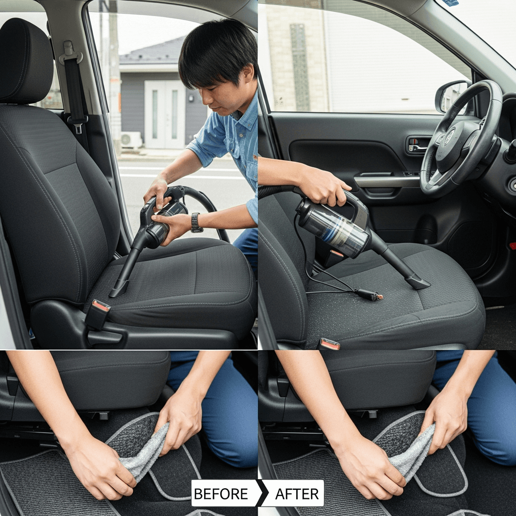 アプローズは第一印象が査定の8割を決めます。シート隙間のゴミ除去、マット洗浄、樹脂パーツ艶出しで新車級の清潔感に。特に臭いゼロなら「禁煙車」扱いで+5~8万円UP。