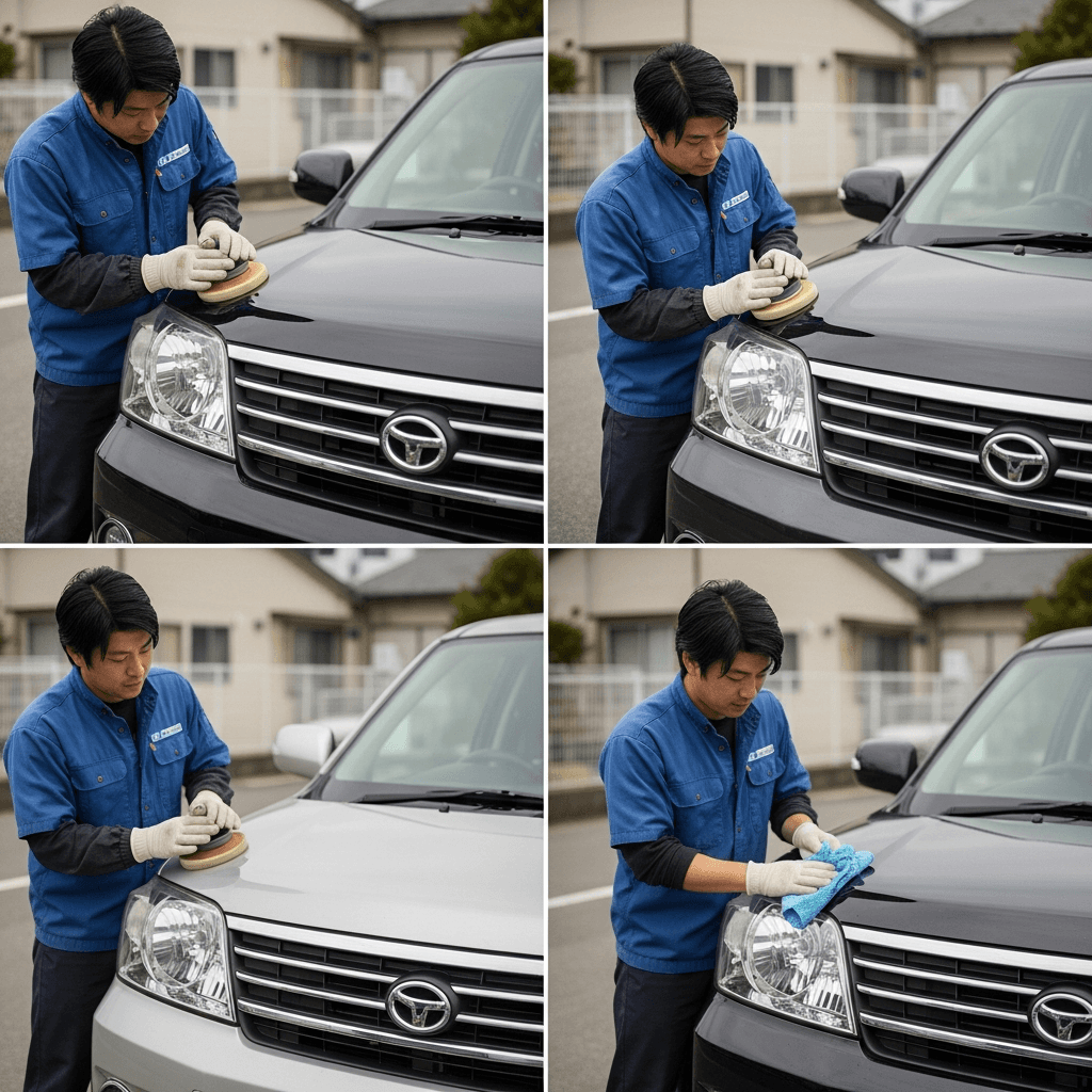 アプローズはヘッドライトの黄ばみとボディの鉄粉が第一印象を損ねます。研磨+鉄粉除去クリーナー+ワックスで輝きを取り戻せば「程度良好」と判断され+4~7万円の効果。
