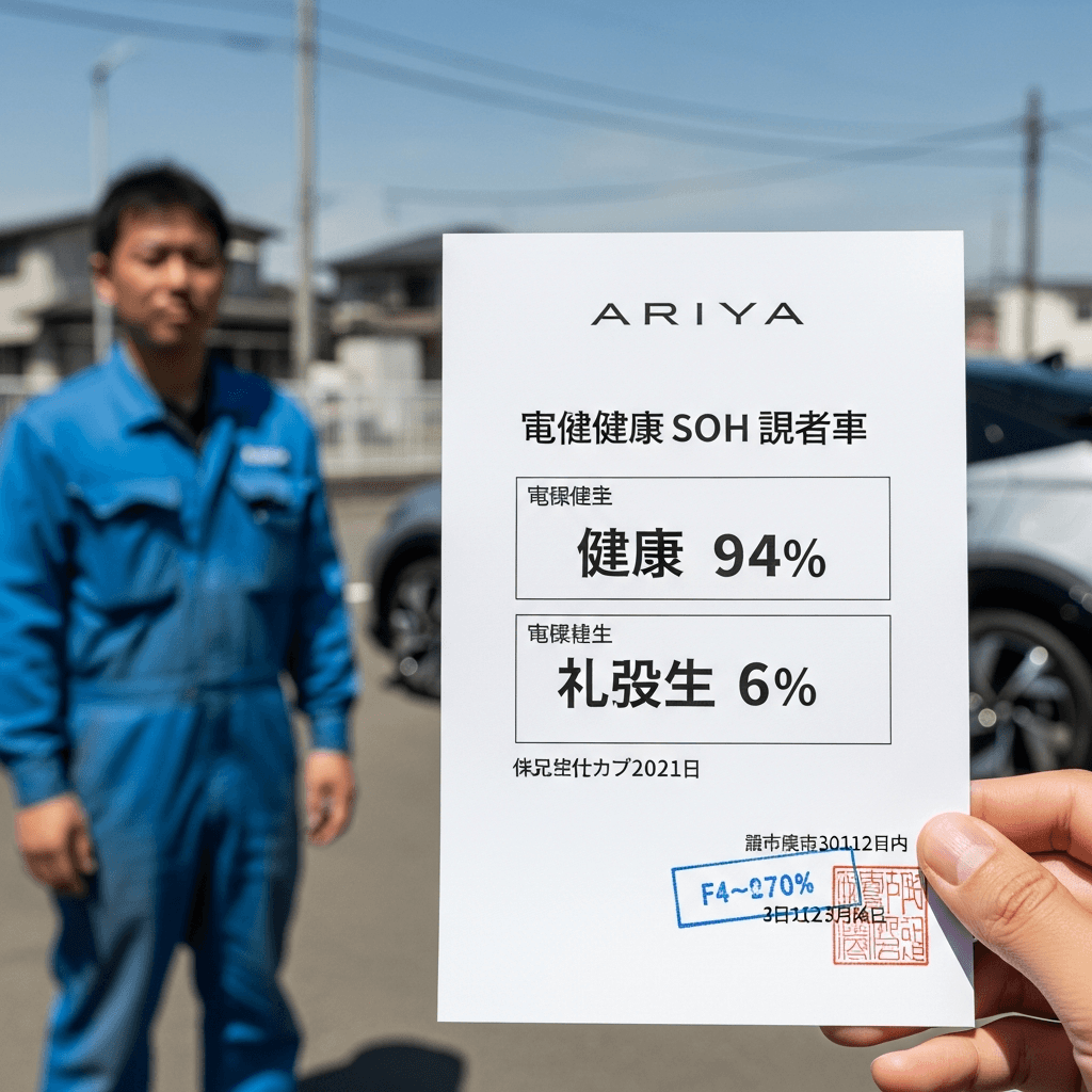 EVの最大不安はバッテリー劣化。ディーラーでSOH(バッテリー健全性)診断を受け、「90%以上」の証明書があれば査定額が劇的にUP。診断費用5,000円で+12~20万円のリターンが期待できます。