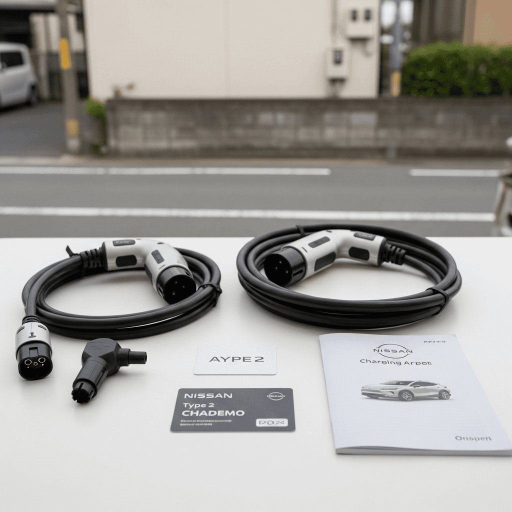EV車の査定は充電環境が全て。アリアの純正充電ケーブル(普通・急速)、充電カード(会員証)、アダプター類を全て揃えて撮影。「すぐ使える」安心感で+6~10万円UPが期待できます。