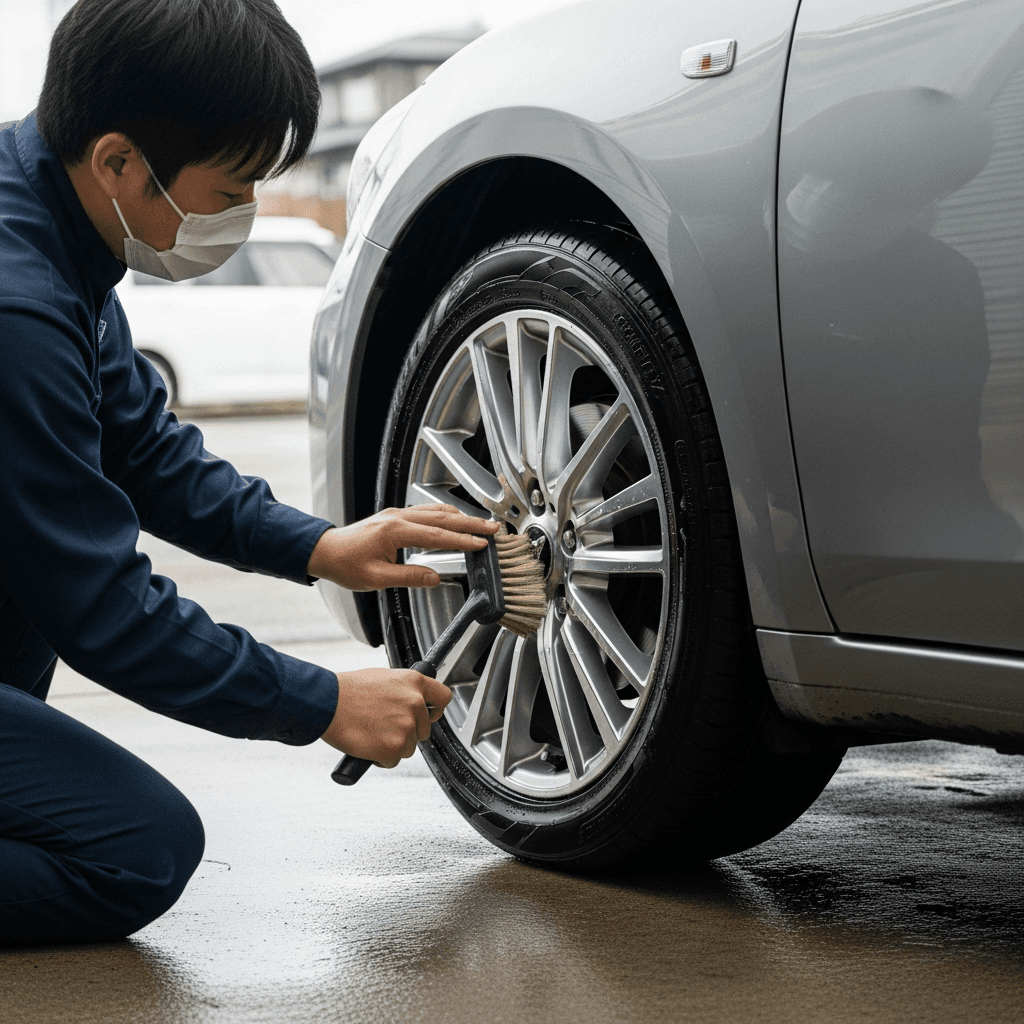 セダンは純正アルミホイールの傷が目立ちやすい。ホイールクリーナーで洗浄+タイヤ溝5mm以上確保で「足回り良好」評価。特にアテンザは高級感が重要で+6~9万円の効果。