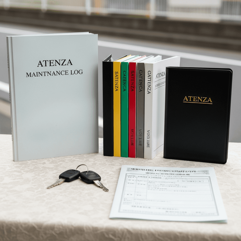 アテンザは高級セダンとして書類完備が必須。整備記録簿、取扱説明書、スペアキー2本が揃っていれば「ワンオーナー級の管理」で+4~7万円UP。特にスペアキーは重要。