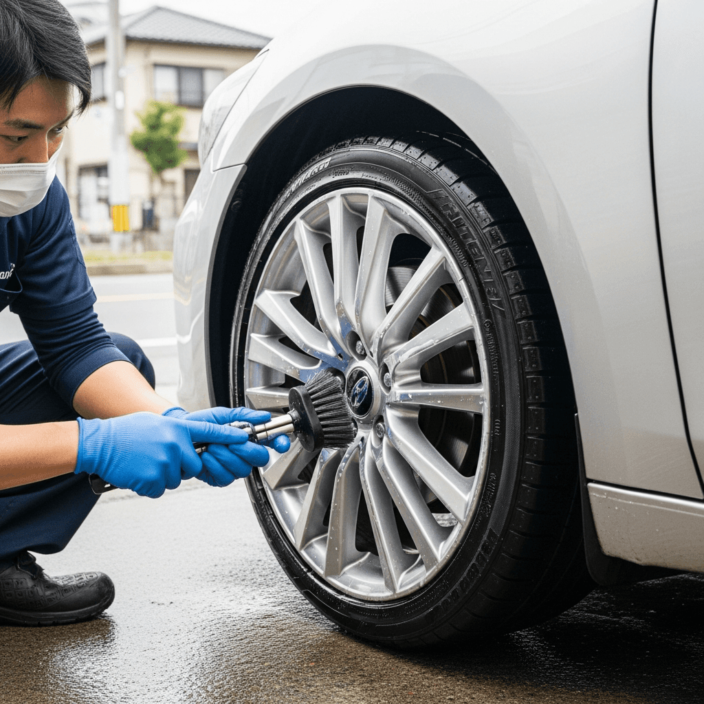 セダンは純正アルミホイールの傷が目立ちやすい。ホイールクリーナーで洗浄+タイヤ溝5mm以上確保で「足回り良好」評価。特にアテンザスポーツワゴンは高級感が重要で+6~9万円の効果。