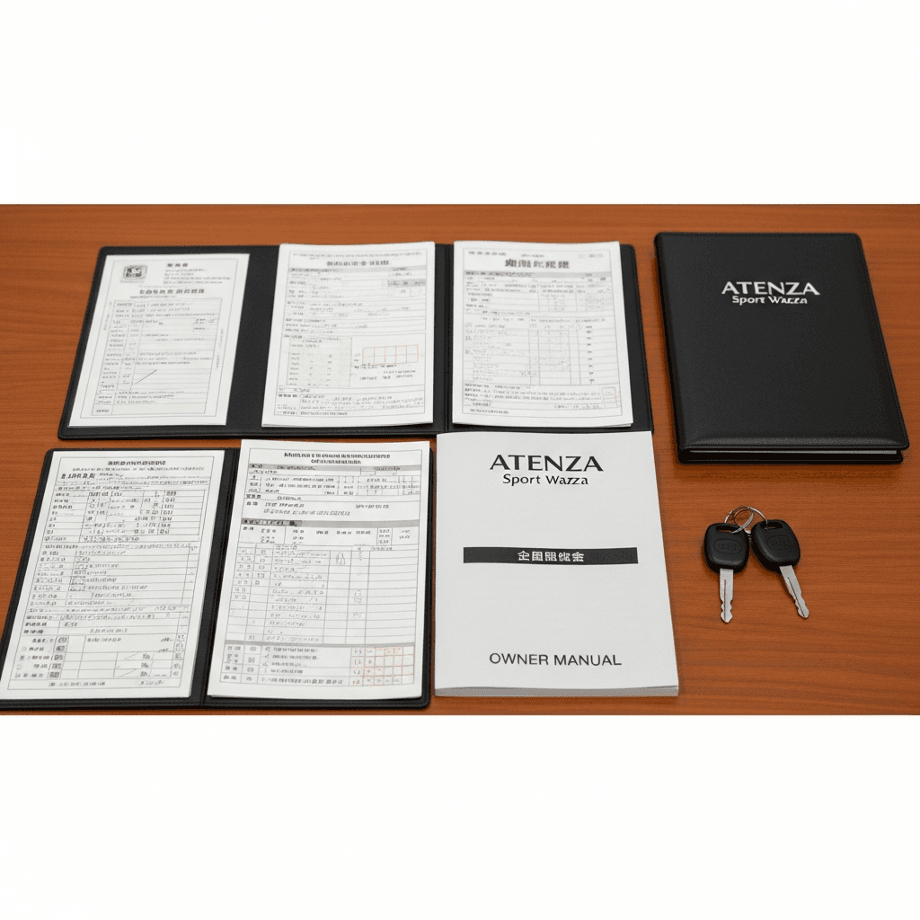 アテンザスポーツワゴンは高級セダンとして書類完備が必須。整備記録簿、取扱説明書、スペアキー2本が揃っていれば「ワンオーナー級の管理」で+4~7万円UP。特にスペアキーは重要。