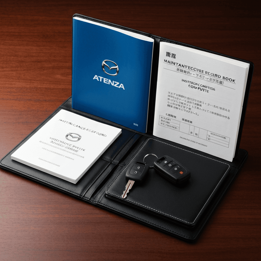 アテンザワゴンは高級セダンとして書類完備が必須。整備記録簿、取扱説明書、スペアキー2本が揃っていれば「ワンオーナー級の管理」で+4~7万円UP。特にスペアキーは重要。