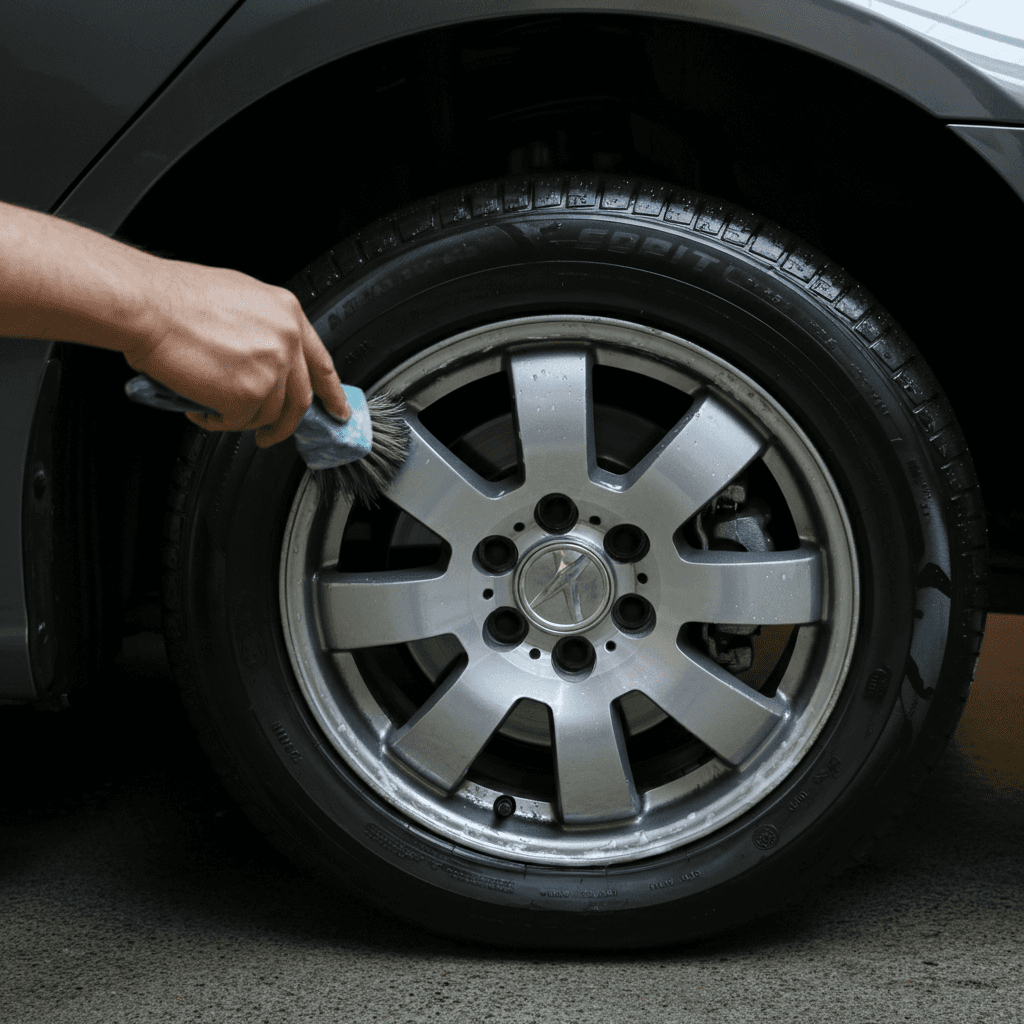 セダンは純正アルミホイールの傷が目立ちやすい。ホイールクリーナーで洗浄+タイヤ溝5mm以上確保で「足回り良好」評価。特にアテンザワゴンは高級感が重要で+6~9万円の効果。