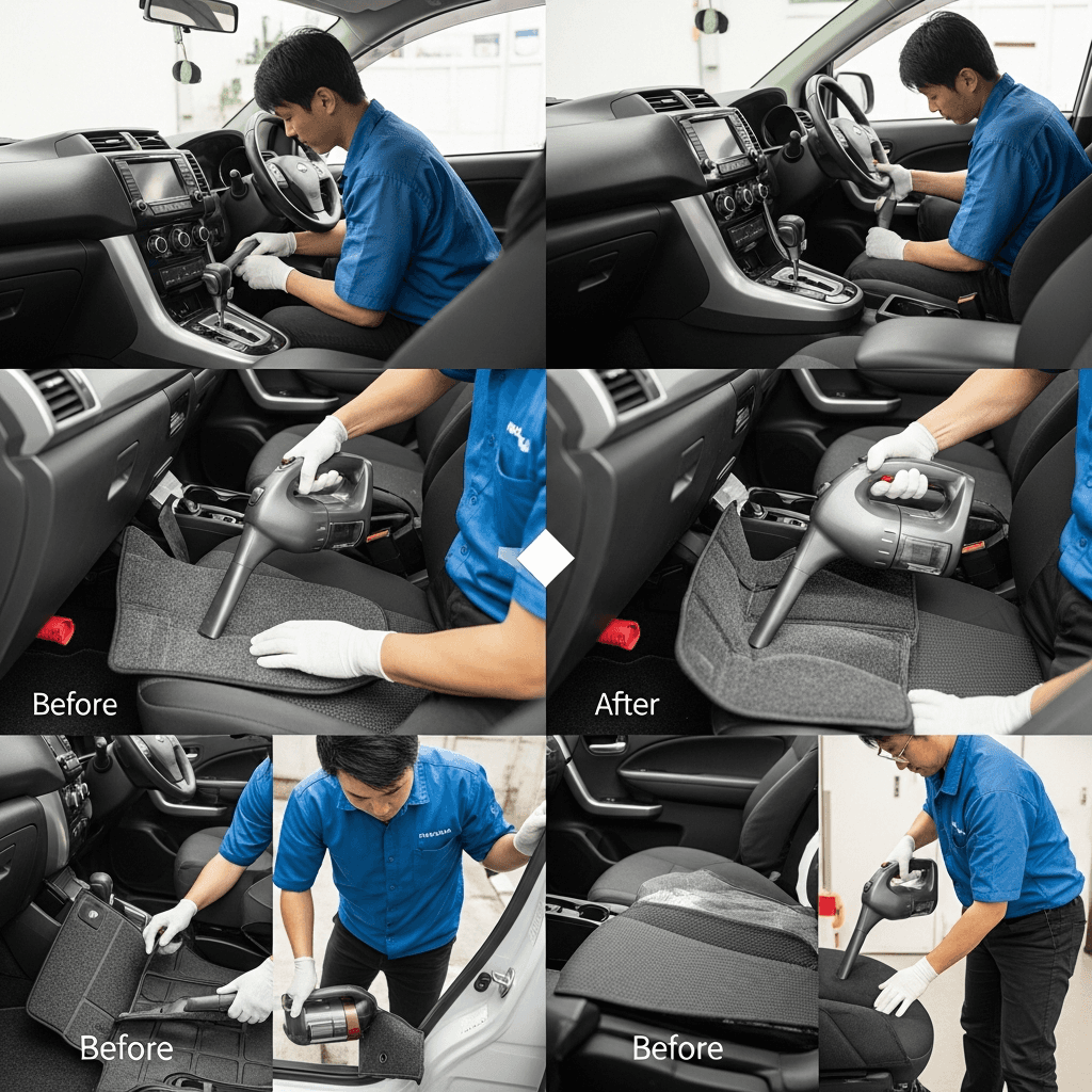 アトラスは第一印象が査定の8割を決めます。シート隙間のゴミ除去、マット洗浄、樹脂パーツ艶出しで新車級の清潔感に。特に臭いゼロなら「禁煙車」扱いで+5~8万円UP。