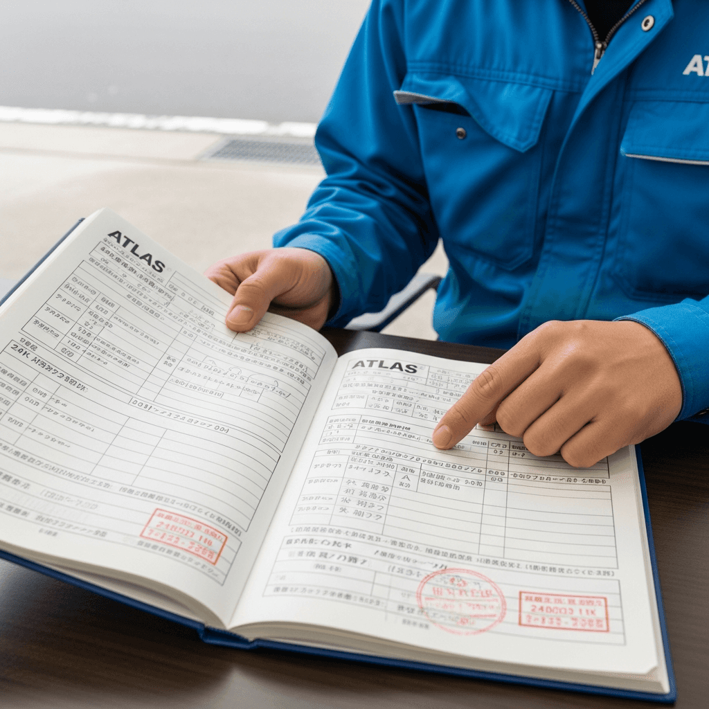 アトラスの整備記録簿に定期点検(12ヶ月・24ヶ月)の履歴が全て記載されていれば「管理の行き届いた車」と高評価。特にエンジンオイル交換履歴は重要で+6~9万円の効果。