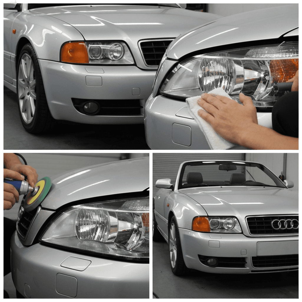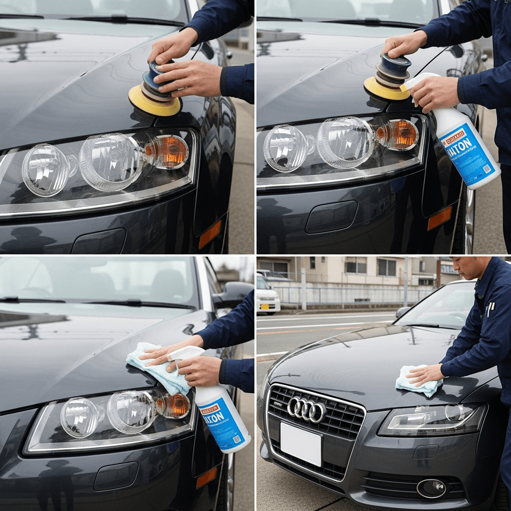 アウディカブリオレはヘッドライトの黄ばみとボディの鉄粉が第一印象を損ねます。研磨+鉄粉除去クリーナー+ワックスで輝きを取り戻せば「程度良好」と判断され+4~7万円の効果。