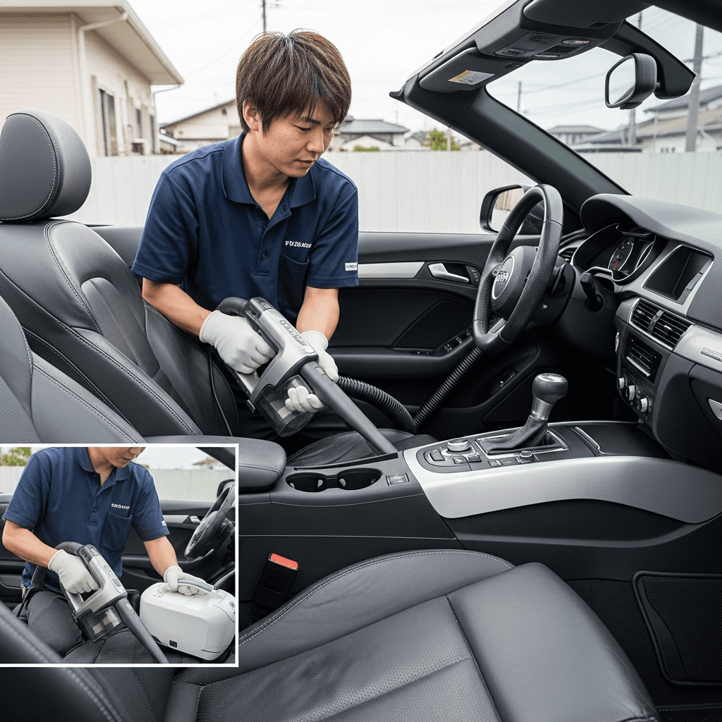 アウディカブリオレは第一印象が査定の8割を決めます。シート隙間のゴミ除去、マット洗浄、樹脂パーツ艶出しで新車級の清潔感に。特に臭いゼロなら「禁煙車」扱いで+5~8万円UP。