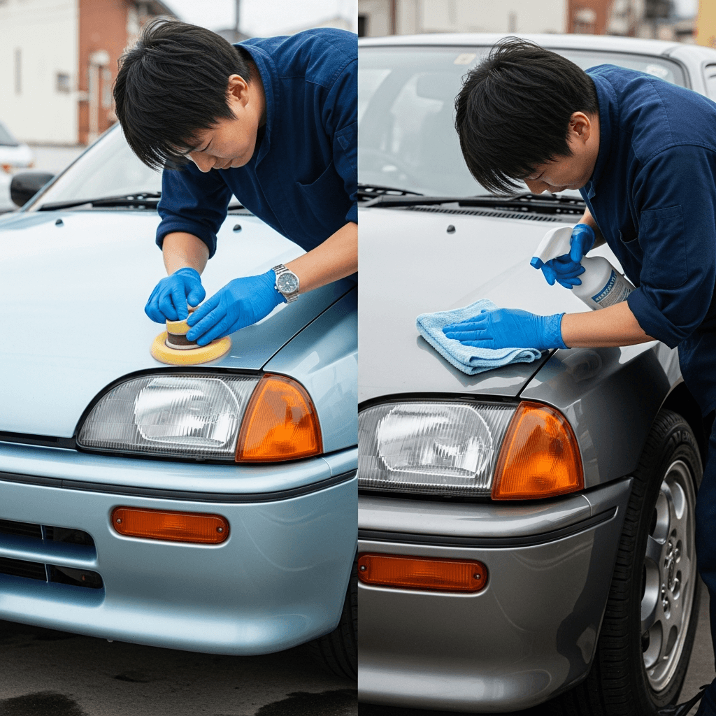 AZ-1はヘッドライトの黄ばみとボディの鉄粉が第一印象を損ねます。研磨+鉄粉除去クリーナー+ワックスで輝きを取り戻せば「程度良好」と判断され+4~7万円の効果。