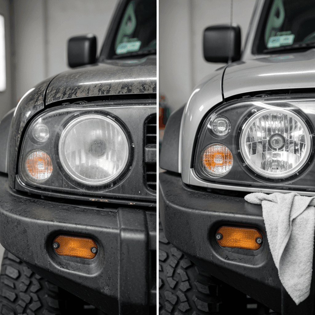 AZ-オフロードはヘッドライトの黄ばみとボディの鉄粉が第一印象を損ねます。研磨+鉄粉除去クリーナー+ワックスで輝きを取り戻せば「程度良好」と判断され+4~7万円の効果。